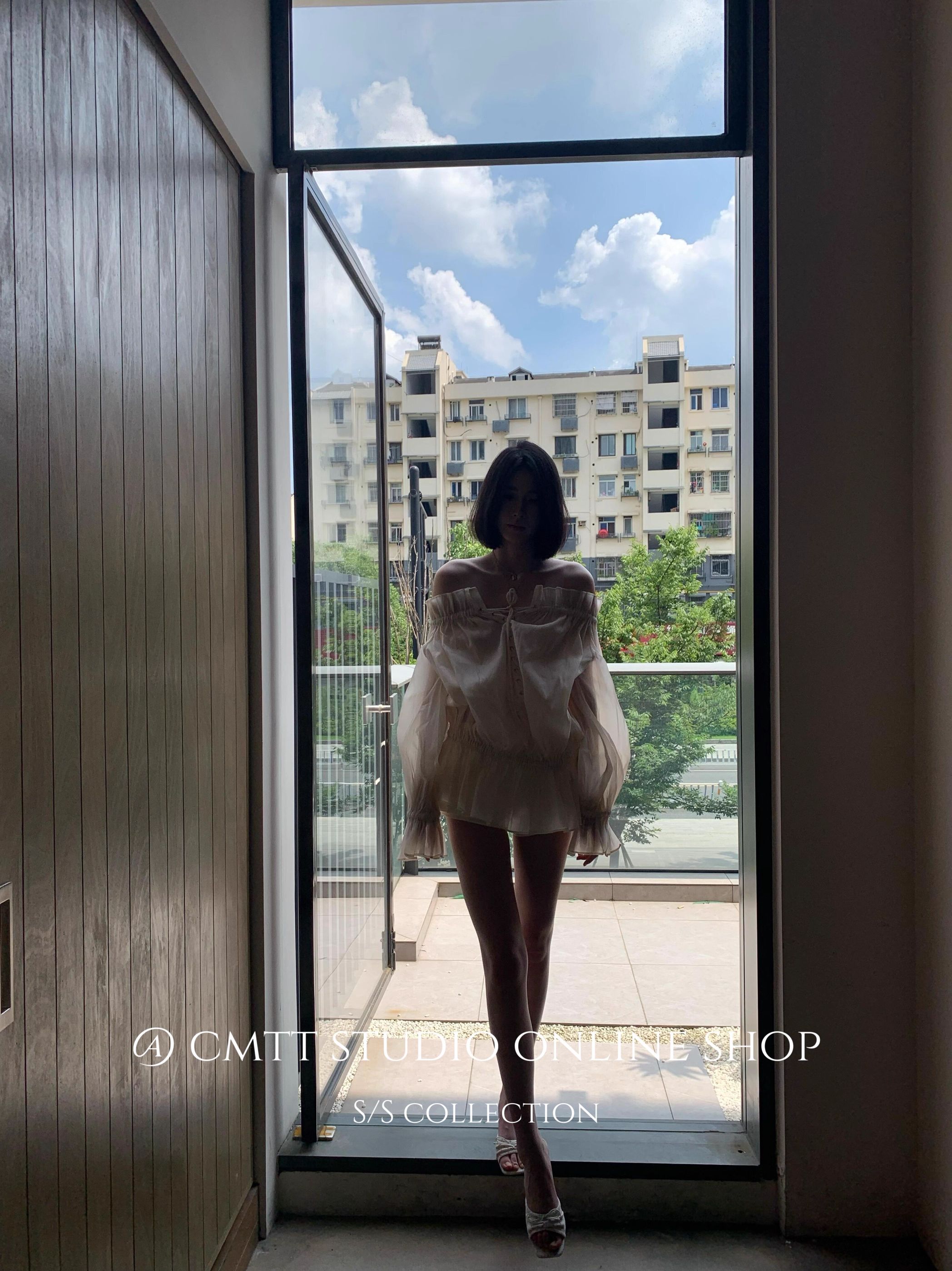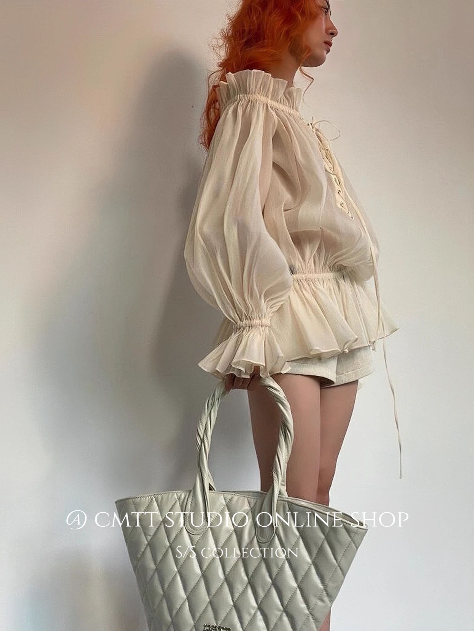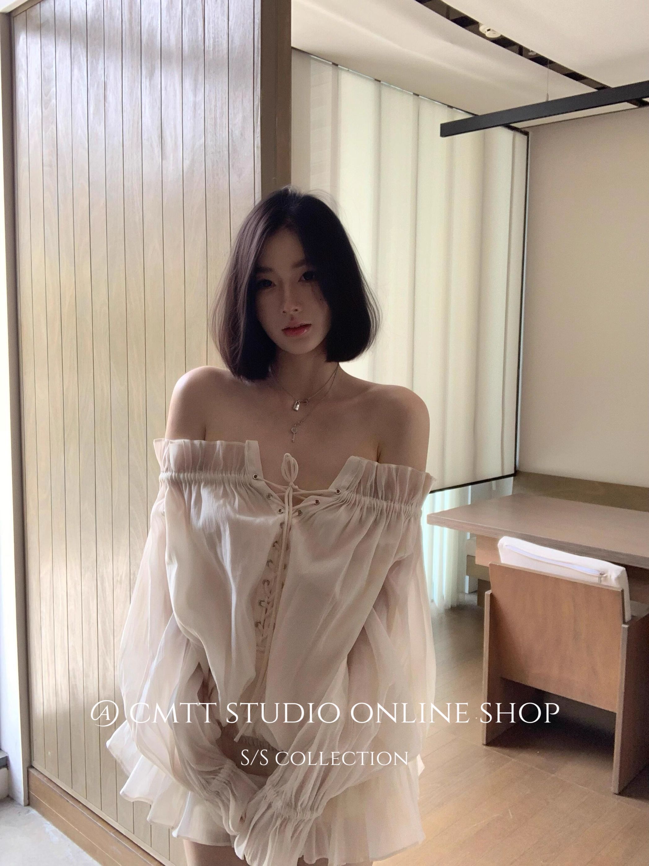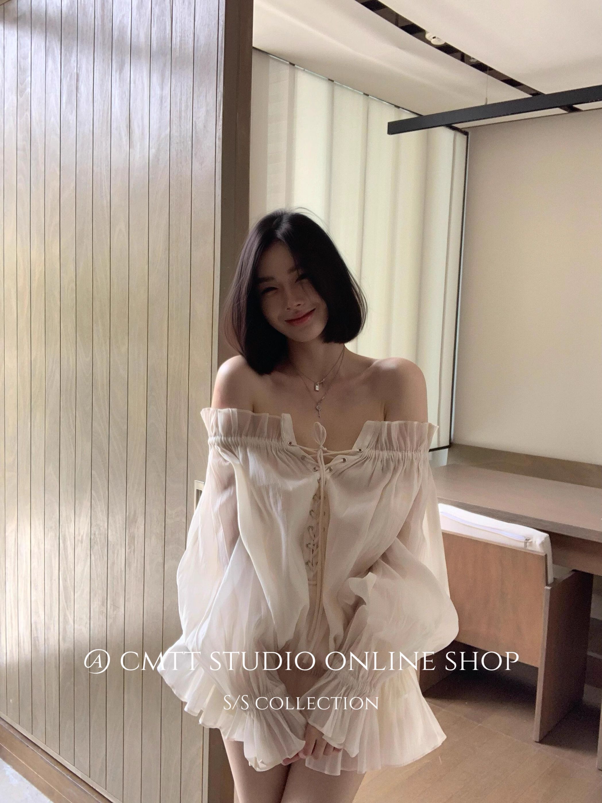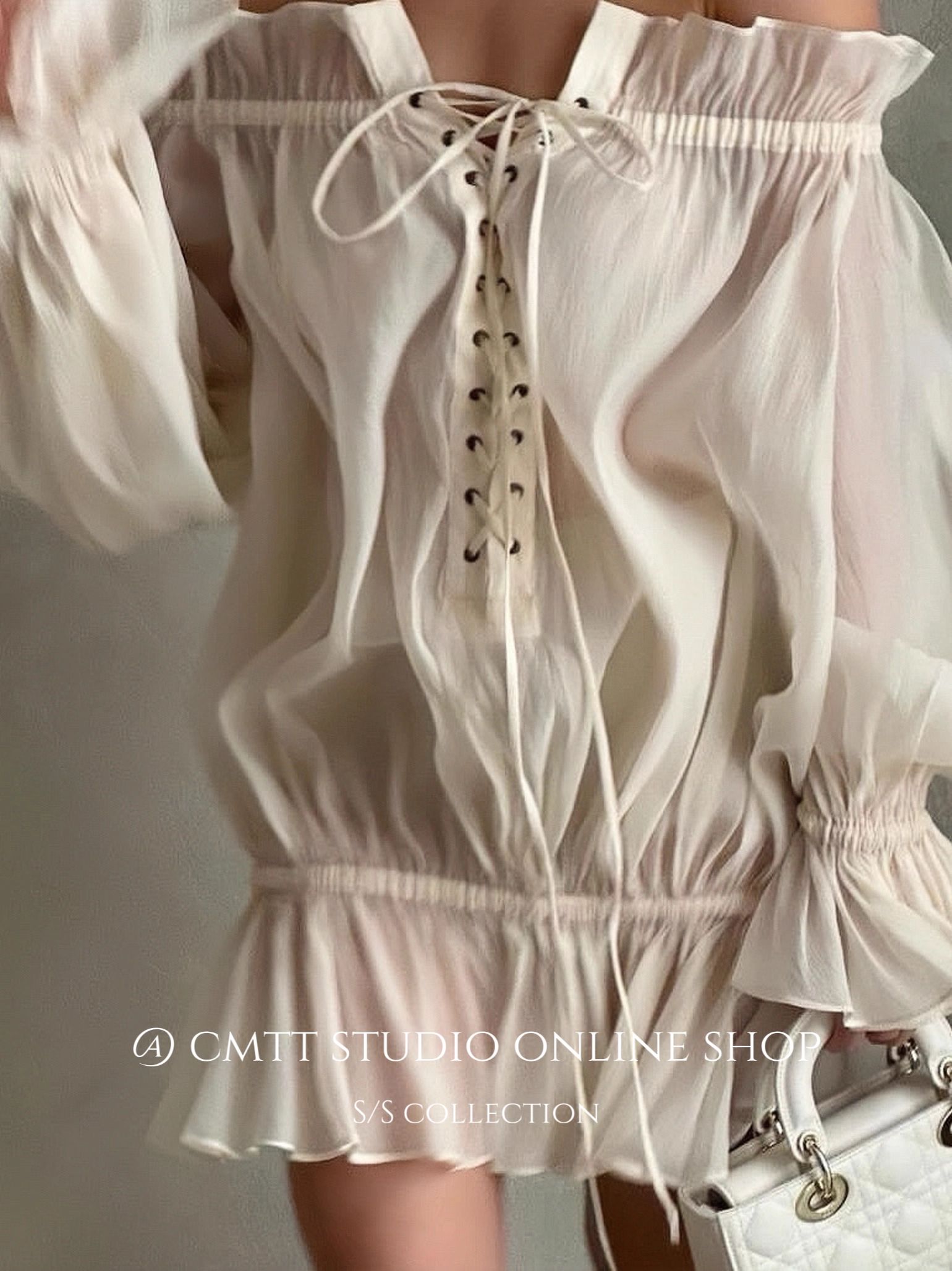 越南小众法式一字领绑带灯笼袖网纱衬衫浪漫氛围感上衣度假